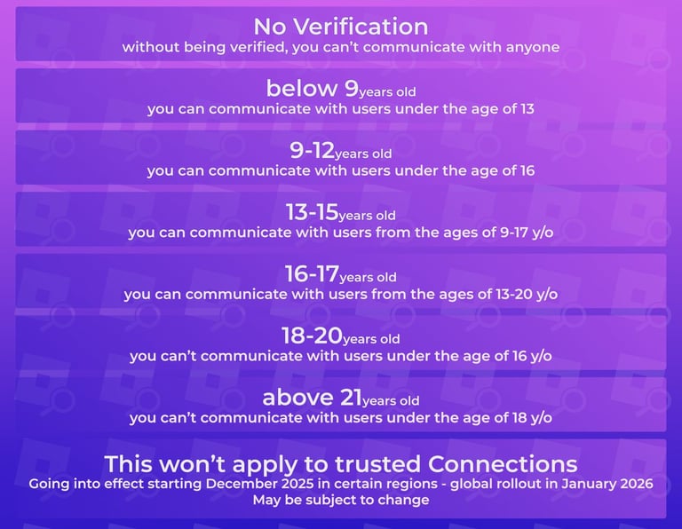 Roblox chat verification is a mandatory system requiring users to confirm their age via Facial Age Estimation (using a webcam/phone camera) or Government ID to access features like in-experience chat, voice chat, and party chat, ensuring communication primarily happens with peers in similar age groups for safety. This system categorizes users (e.g., under 9, 9-12, 13-15, 16-17, 18+), restricting communication to their group or similar ones, with younger users (under 9) needing parental consent to chat at all. Verification is done through the app, with images for facial scans deleted immediately after processing.